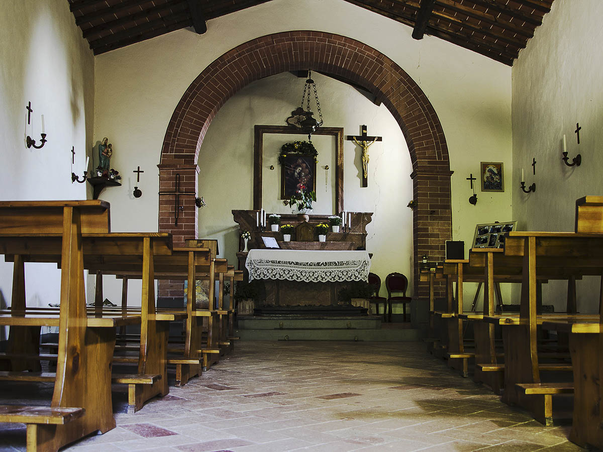 The hill still contains the remains of the ancient castle of the “Pietra” (lit. rock, the original name of this hill, from which the current name of the sanctuary, “Pietrina”, derives its name), whose existence has been documented since AD 1118. The building changed ownership a number of times from the Middle Ages to the Modern Age. The castle along with the adjoining church of St Andrew actually became a minor municipality whose domain extended to nearby hamlets, such as Palagio, Casicello and S. Leonardo, which was governed, over the centuries, first by Volterra, then San Gimignano and Florence, and lastly, Montaione. Today only two crumbling towers remain of the castle, while the church has been more fortunate. The history of the small sanctuary church is linked to a painting, a polyptych from the second half of the fourteenth century, attributed to the Sienese artists, Bartolo di Fredi, a pupil of Simone Martini, created when the painter was active in nearby Volterra. Only the central panel has survived, depicting the Madonna and Child, with the infant Jesus holding an apple in his hand. A copy of the painting can be seen in the church, while the original is kept in the Curia of Volterra for security reasons. The Madonna of the Pietrina has been the focus of a widespread devotional tradition throughout the centuries, unceasingly nurtured by the local people, which is a testament to the extent that such religious practices helped shape the life, culture and identity of these places. Today this devotion is expressed above all during the feast day, with a solemn procession that takes place here on the last Sunday of September.
